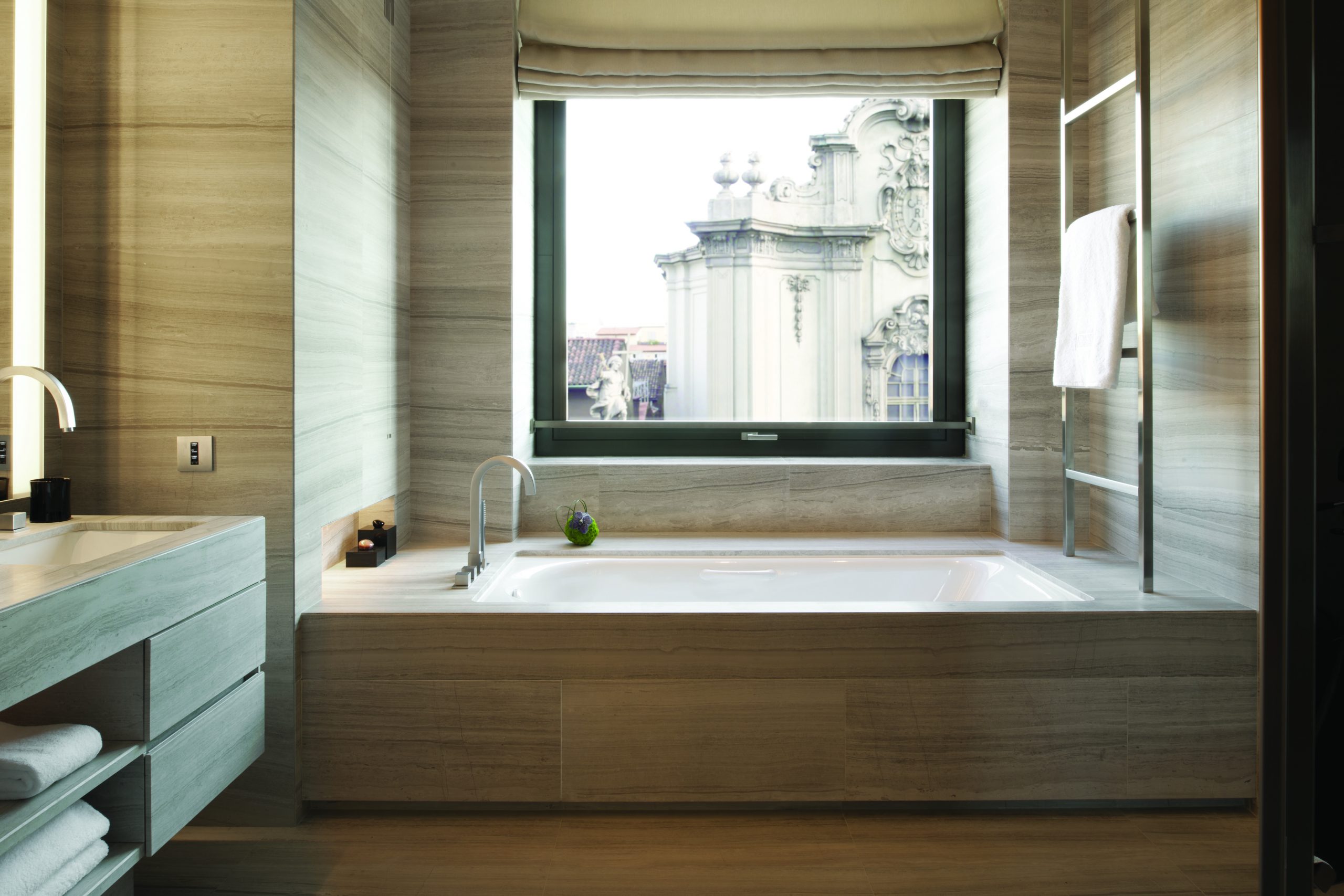 • Armani Milano Suite – This exclusive suite  overlooks the Duomo Cathedral and the center of Milan from its intimate terrace. The suite features an elegant living room with fully equipped kitchen, a guest bathroom, a dining room and a private study.