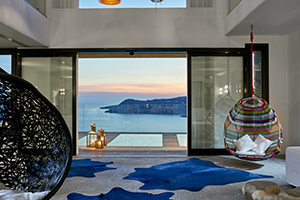 - The Avaton pool terrace, seemingly suspended in thin air, features the famous infinity pool merging almost seamlessly on the horizon line with the vast Aegean below.