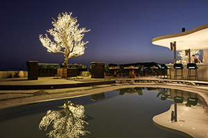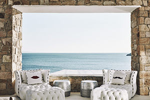• Twin saltwater pools and Jacuzzi tub, feet-in-the-water cocktail bar with panoramic views of the Aegean sea.