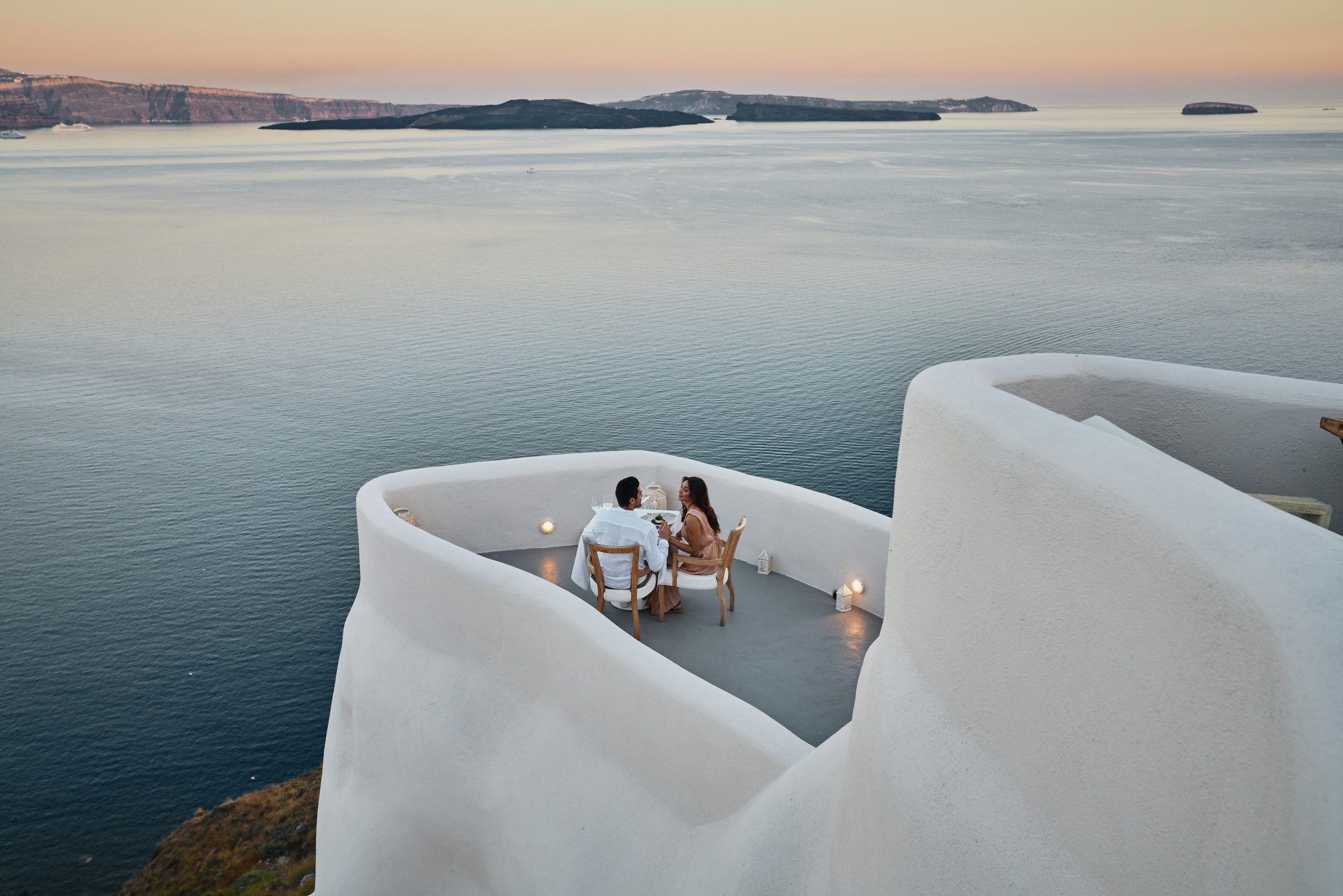 - The Private Dining options, in one of the secluded terraces at the Caldera’s edge, lend themselves for the ultimate Santorini dining experience, while overlooking the volcano and the infinite blue of the Aegean sea.